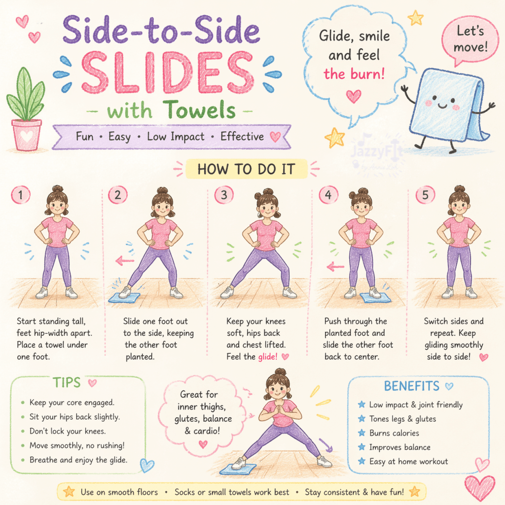 You place a towel (or wear socks) under one or both feet, then slide your foot out to the side and pull it back in, shifting your weight smoothly from one leg to the other.